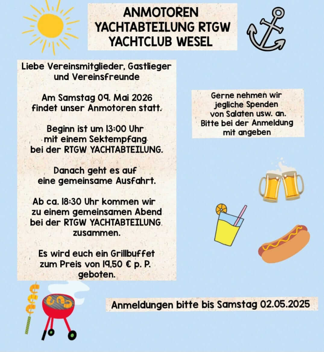 Das Ansegeln/Anmotoren 2026 des Yacht-Clubs Wesel findet wieder gemeinsam mit der Yachtabteilung der RTGW statt. Wir treffen uns um 13 Uhr bei der RTGW-Yachtabteilung zum Sektempfang und machen dann eine gemeinsame Ausfahrt. Ab ca. 18:30 kommen wir zu einem gemeinsamen Abend bei der RTGW SYachtabteilung zusammen. Es gibt dort ein Grillbüffet zum Preis von 19,50 EUR pro Person.